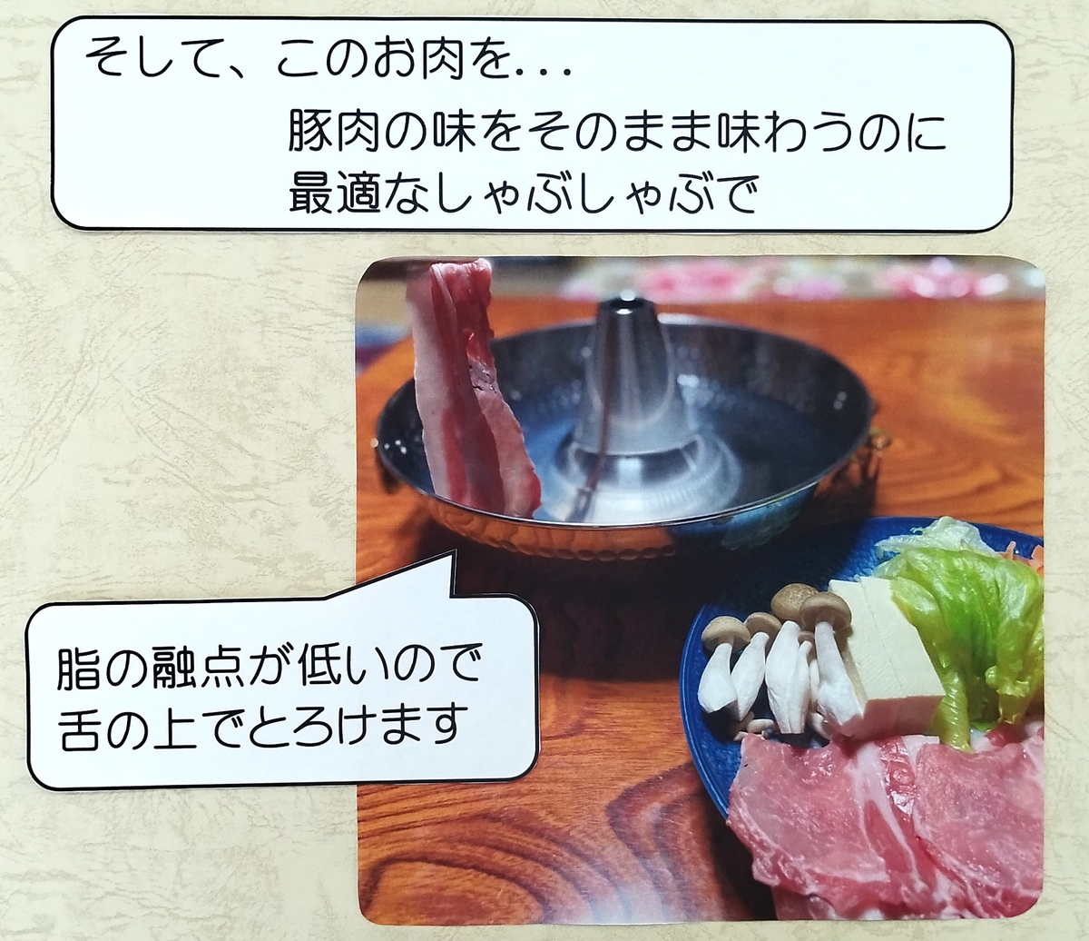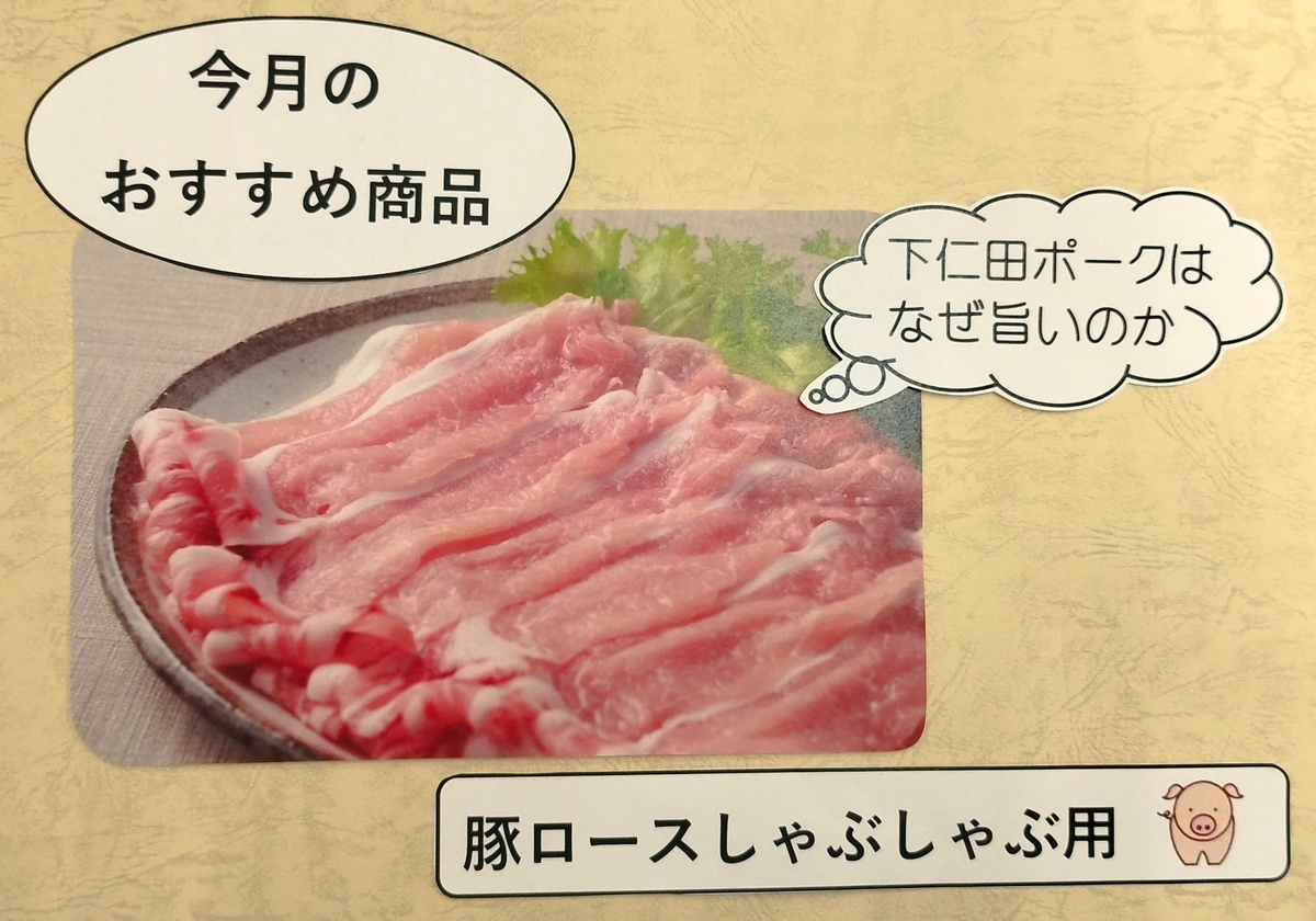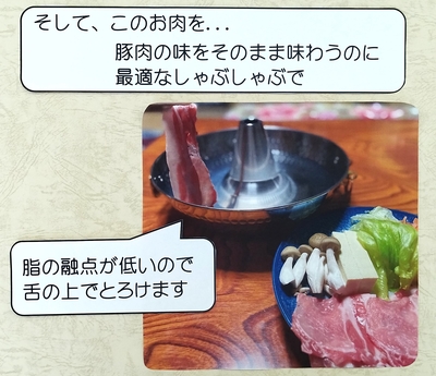 シンプルなしゃぶしゃぶは下仁田ポーク本来の美味しさがよくわかります。脂身と赤身のバランスが良いロース肉で、ジューシーで柔らかな赤身と甘みのあるさっぱりとした脂を是非味わっていただきたいと思います。