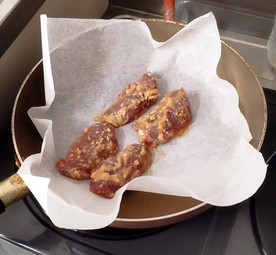 冷蔵庫で一晩~1日ほどかけてゆっくり解凍していただき、味噌が焦げやすいためフライパンにクッキングシート等を敷き、弱火でじっくり焼いてお召し上がりください。