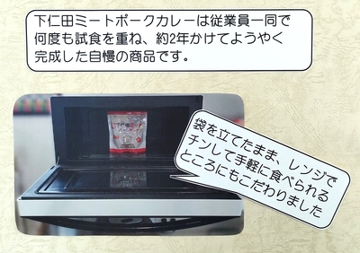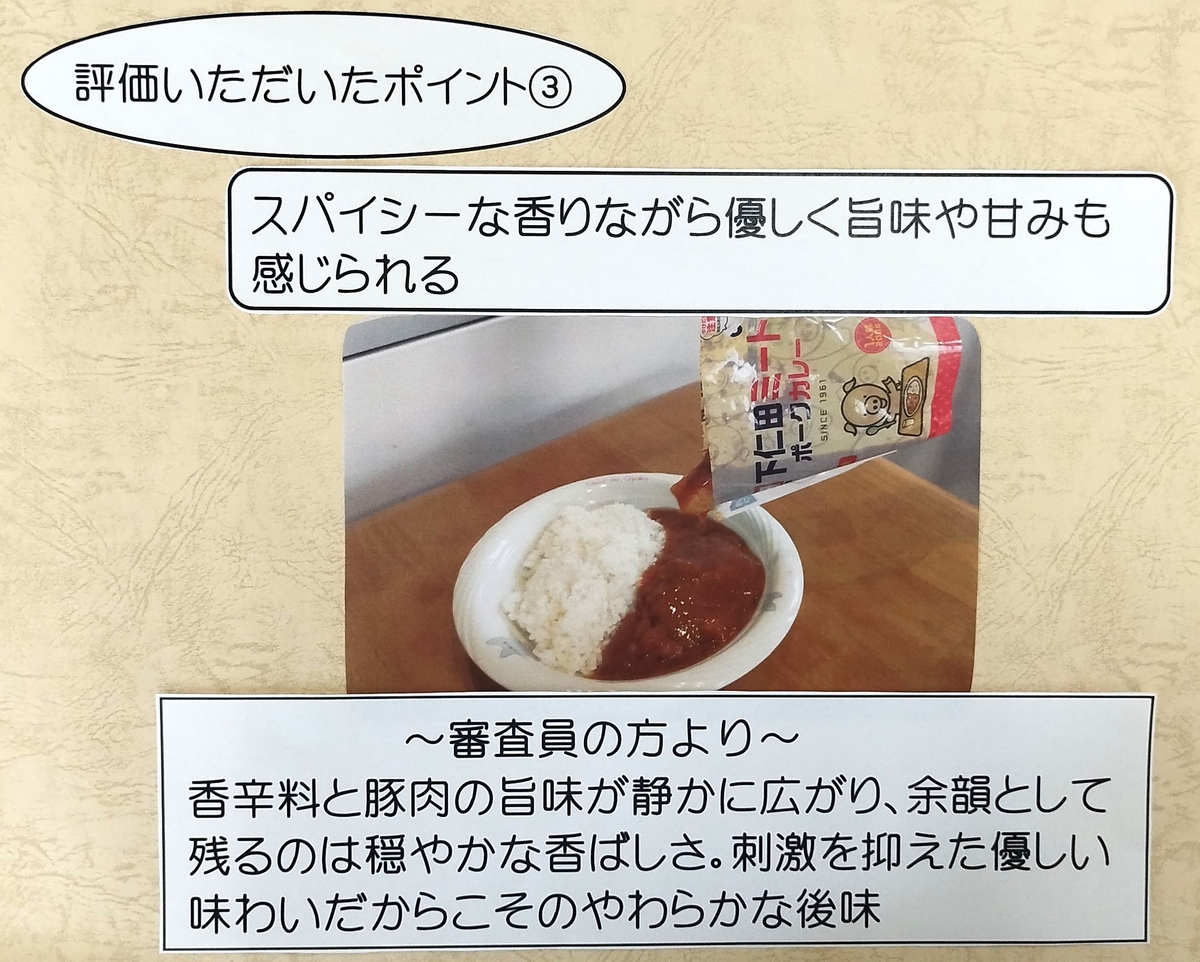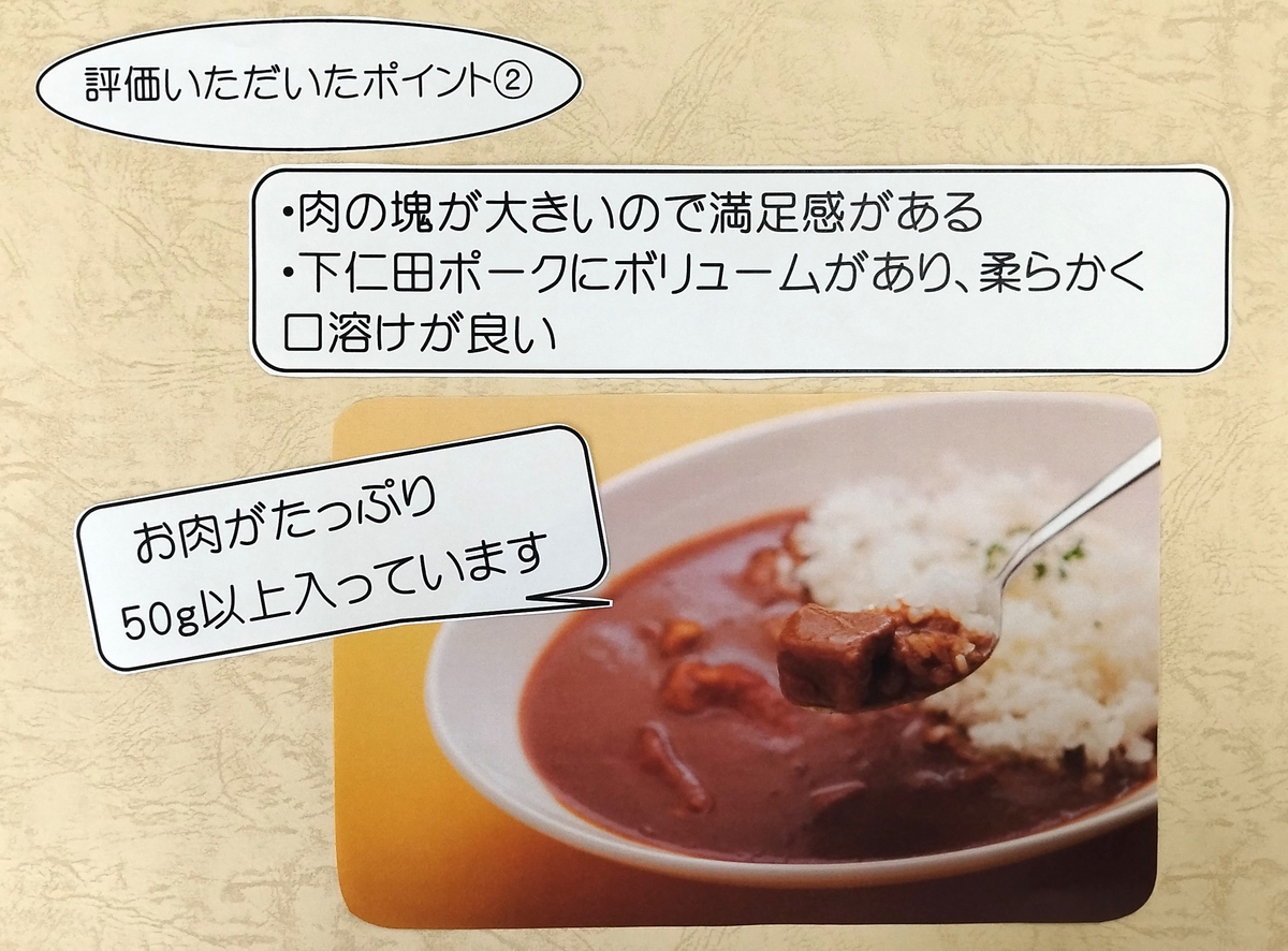 試食中の「美味しいレトルトカレーは皿に移した時に脂がある」という気づきから、最後に下仁田ポークの背脂を加えるアイデアが誕生。そこから独自の“コクのある味わい”が完成しました。