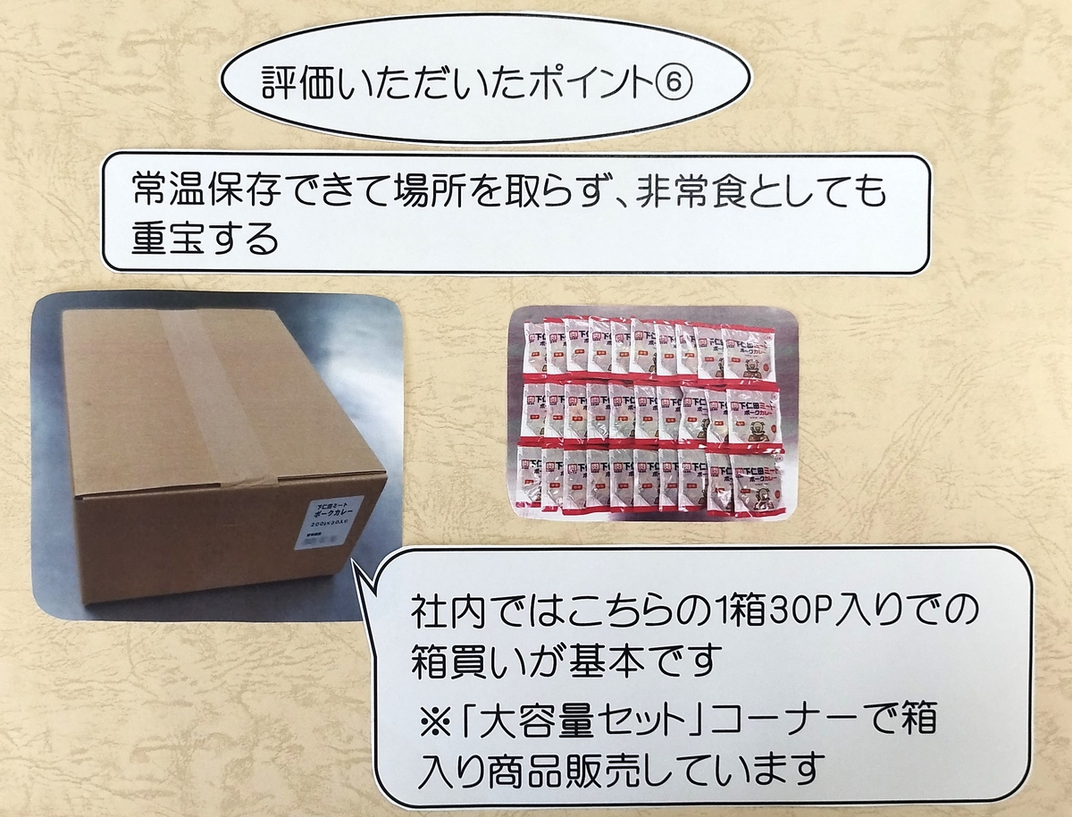 さらに、袋を立てたまま電子レンジで温められる手軽さや、常温保存できる便利さも特徴。忙しいときにもサッとお手軽にお召し上がりいただけます。