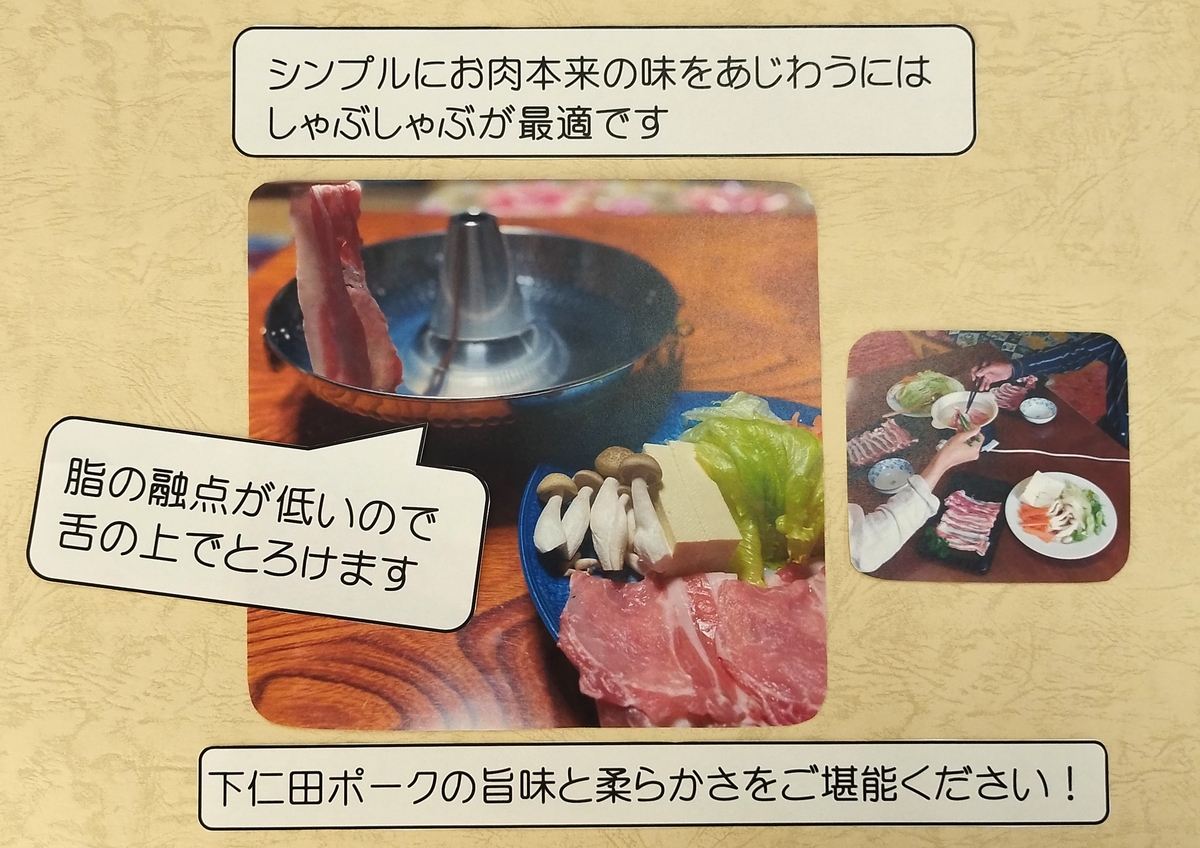 シンプルなしゃぶしゃぶは下仁田ポークの肉本来の美味しさがよくわかります。脂身と赤身のバランスが良いロース肉で、ジューシーで柔らかな赤身と甘みのあるさっぱりとした脂を是非味わっていただきたいと思います。